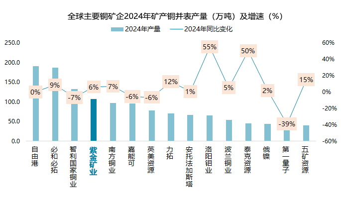 公司矿产铜产量突破百万吨大关后再增长,全年实现107万吨,位居全球前四,同比增长6%,近五年保持24%复合增长率,为全球主要铜企中矿产铜增长最多的公司之一。根据中国有色金属工业协会数据,2024年中国实现矿山产铜164.3万吨,公司矿山产铜相当于中国总量的65%。